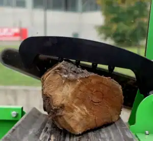 Sectioning the log to adjustable lengths of 20 or 60 centimetres, using a sliding carriage and hydraulic chainsaw bar.