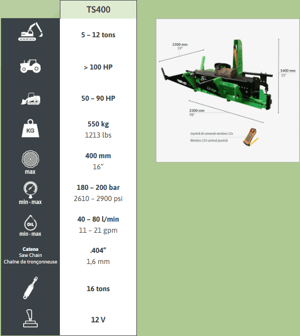 All functions are controlled via the included 12-volt radio remote control, offering precision, convenience, and complete safety. Thanks to its speed and efficient workflow, the TS400 can process large quantities of wood effortlessly, reducing manual labour and fatigue while producing consistently sized firewood for stoves and fireplaces.