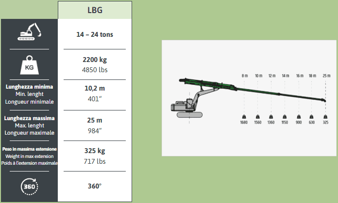 For precise and safe operation, the LBG boom comes equipped with a wireless camera positioned at the top. The live feed is displayed on a screen inside the cab, giving the operator full visibility of the working area even at maximum extension. The hydraulic setup requires two single- or double-acting lines, along with a drainage line, ensuring smooth and reliable operation.